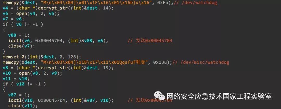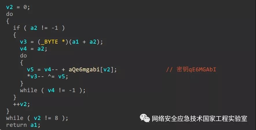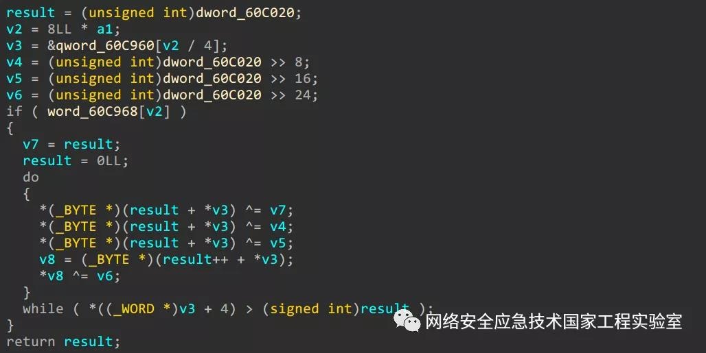 具体加解密算法与Mirai相同,密钥为0x0deadbeef,所有字符串的使用都是用时解密,用完即恢复加密,加解密算法如图14所示: