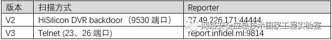 Moobot扫描模块采用全网扫描,并将扫描结果上报Reporter,最后由Loader针对漏洞设备植入样本,历史上其存在多种扫描版本: