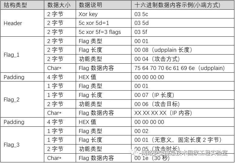 攻击模块方面,Moobot_Trap延用了Mirai的攻击形式,样本包括7种攻击模式。