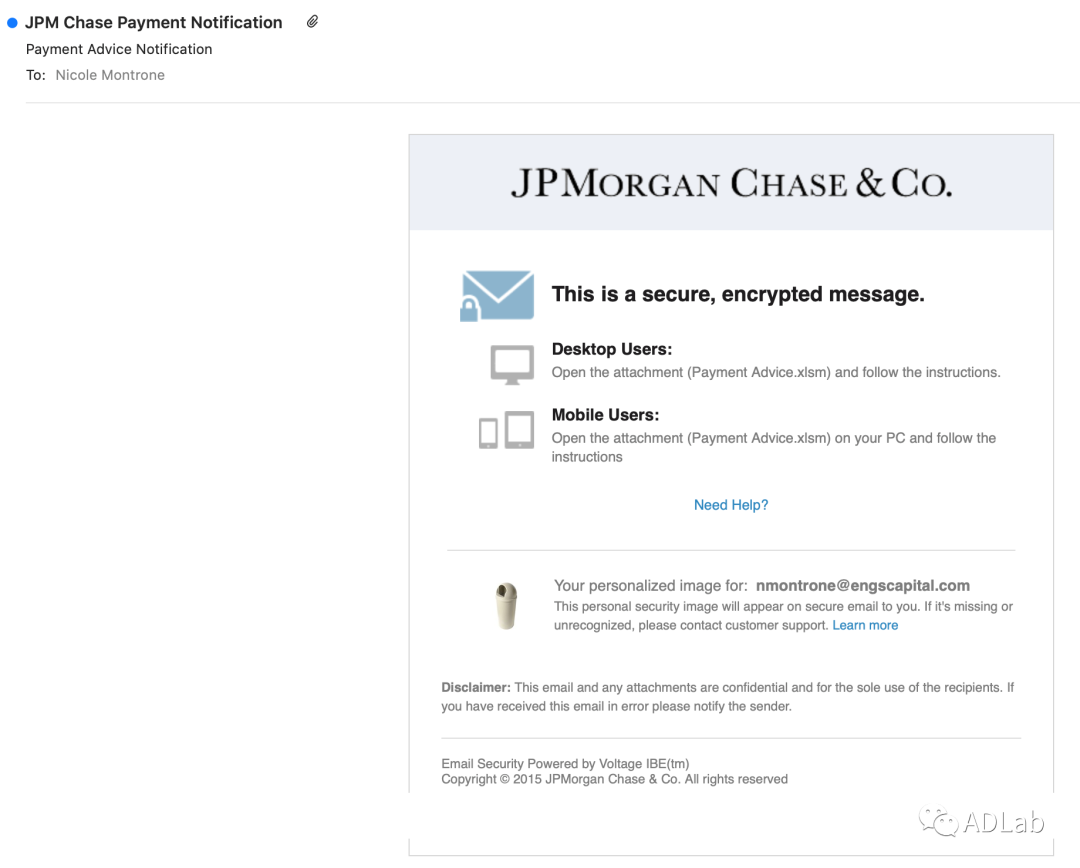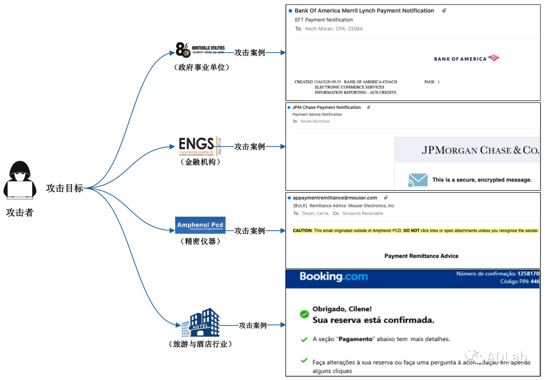 2020年8月中旬,启明星辰ADLab监测到一封题为“电子转账付款账单”的恶意邮件,该邮件以“美国银行”的名义发起钓鱼邮件攻击,其附件为一个excel表格文件(图1为本次攻击的一个邮件样本,目标为美国阿拉巴马州亨茨维尔市公共事业公司“Huntsville Utilities”),通过多级代码跳转最终向目标植入Remcos RAT,以窃取目标主机的机密信息。在初步分析后,除了零散的样本信息外,我们没有在公开情报和私有情报库中找到任何与攻击及攻击背后的黑客组织相关的信息。通过对基础设施的关联分析,发现该黑客组织与多次物联网攻击有着紧密的关系,因此我们决定对本次攻击活动及其背后的攻击团伙进行一次摸底。我们很快关联到8月初另外几起相同手法的攻击,这几起攻击伪装成了“美国大通银行”和“美国富国银行”向金融机构“ENGS”投放攻击代码(图2)。