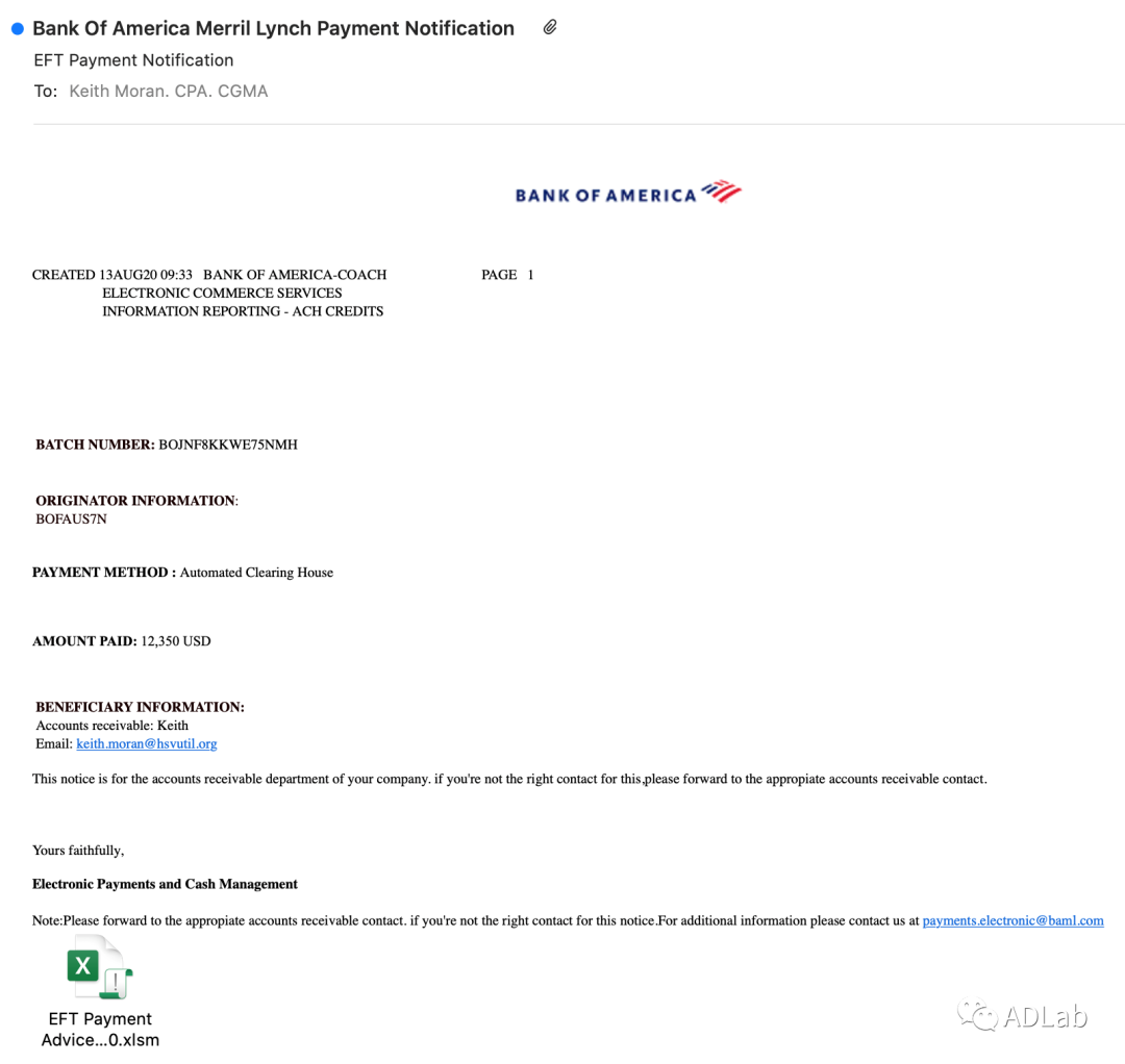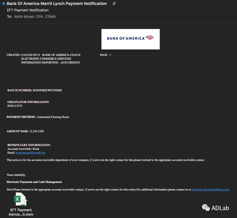 此次攻击始于一封将来源伪装成“美国银行”的钓鱼邮件(见图17),此邮件是发送给美国阿拉巴马州亨茨维尔市公共事业公司“HuntsvilleUtilities”的员工的。整个邮件看起来像是一个付款通知账单邮件:邮件以“美国银行美林付款通知”为主题,“电子转账付款账单-00130820”为诱饵文档名称,正文中简单描述了账单的支付方式和需要支付的金额,在邮件的末尾还提示这封邮件是发送给该公司的应收账款部门。