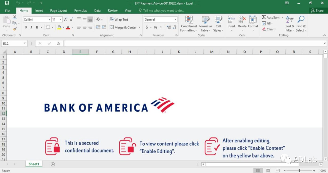 该诱饵文档被伪装成该公司8月份的付款通知账单,从诱饵文档打开后的内容(如图18所示)可以看到,整个excel表格仅包括一张图片,图片中的文字大意为:要想看到被保护的内容,需要启用宏选项。一旦受害者被诱骗启用了宏选项,恶意宏代码便会立即执行。