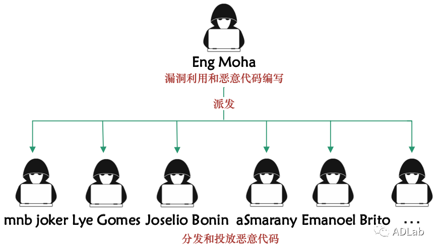 经验表明,如果这个几名黑客属于不相干的组织关系或者产业链的上下游关系,他们操作同一个恶意代码的时间不会如此接近,最短时间甚至只差几分钟,同时攻击手法也不会如此相似,因此我们推断这几个关联出来的黑客属于同一个组织,并且他们都是“海毒蛇”组织的成员。同时可以肯定的是,“Eng Moha”是该黑客组织负责漏洞利用和恶意代码编写的工程师,他为组织提供攻击代码,而其他成员负责维护基础设施、定制诱饵文档和攻击工具、分发和投放恶意代码等工作(见图13)。