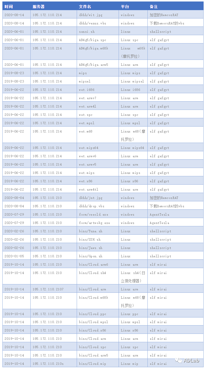 至此,使用以上方法我们已经无法找出更进一步的线索,但是我们得到了更多样本和黑客的活动时间信息。因此,我们转而对8月份攻击活动的另外两个存储服务器(IP:185.172.110.210 和185.172.110.214)进行分析,并找到了“海毒蛇”对这两台服务器的使用记录,表格2为我们整理出来的恶意代码上传记录。
