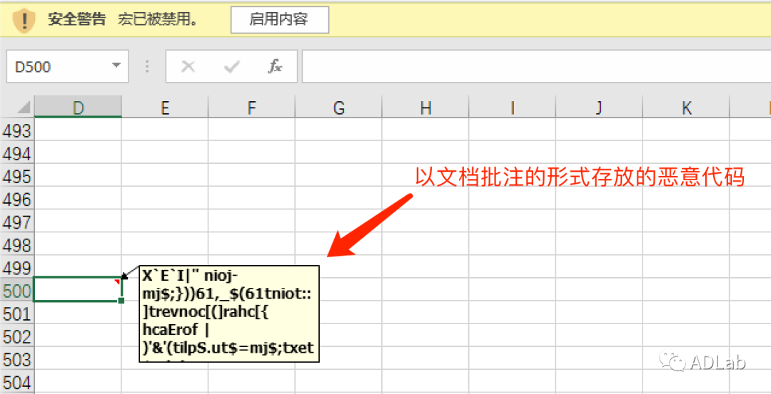 恶意代码被加密保存在诱饵文档excel表格的D500单元格的批注中(见图19)。在以往的此类攻击中,攻击者大多将恶意代码或数据存放在excel电子表格的单元格内容中隐藏显示,或者隐藏到VBA工程中的用户控件里,也有黑客将恶意代码放入文档的内建属性中。而在本次攻击中,攻击者将恶意代码加密存放在了电子表格空白单元格的批注内容里,这种恶意代码隐藏方式在此类攻击中还是首次出现。