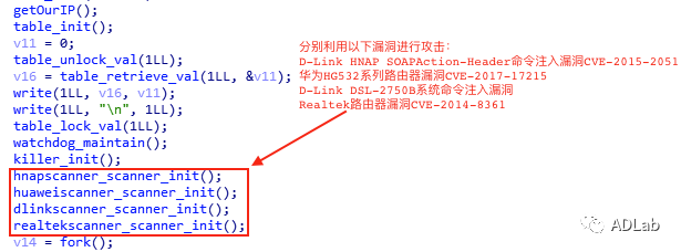 为了掌握更多的信息,我们加大了对该组织使用的物联网僵尸的收集,关联出1384个该组织使用的攻击样本,并通过ADLab物联网自动化分析平台对这些样本进行自动化分析,进一步关联出了100多个C&C服务器。分析结果表明,该组织以往几年常常利用华为HG532系列路由器漏洞CVE-2017-17215、爱尔兰公司“Eir”的D1000调制解调器TR064服务漏洞CVE-2016-10372、Realtek路由器漏洞CVE-2014-8361、D-Link Devices HNAP SOAPAction-Header命令注入漏洞CVE-2015-2051、D-Link DSL-2750B 系统命令注入漏洞等主流的物联网设备漏洞攻击并控制设备。图5是某个样本的攻击代码片段。