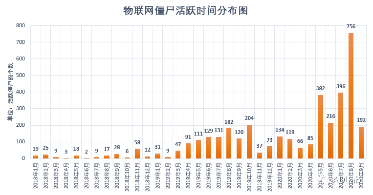 我们对这些样本的活跃数量和活跃时间进行关联统计,绘制了物联网僵尸活跃时间分布图,见图6。从这批样本的攻击时间来看,至少从2018年1月开始,攻击者就开始利用Gafgyt、Mirai组建物联网僵尸网络,然后利用组建好的僵尸网络进行DDoS攻击牟利。2019年3月攻击开始活跃,2019年10月出现了一个小高峰,攻击的最高峰则出现在2020年8月。