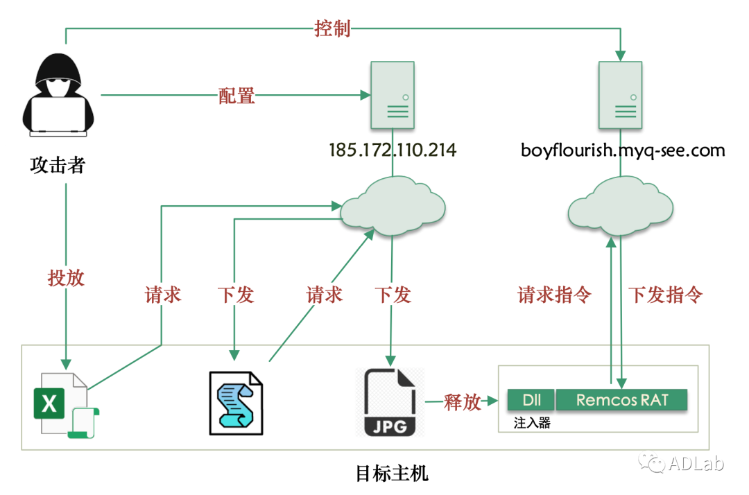 在此次攻击活动中,“海毒蛇”黑客组织使用了新型的恶意代码隐身技巧来隐藏恶意代码。在以往的此类攻击中,攻击者大多将恶意代码或数据存放在excel电子表格的单元格内容中隐藏显示,或者隐藏到VBA工程中的用户控件里,也有黑客将恶意代码放入文档的内建属性中。而在本次攻击中,黑客将恶意代码加密存放在了电子表格空白单元格的批注内容里,这种恶意代码隐藏方式在此类攻击中还是首次出现。恶意代码执行后,会通过多阶段的嵌套下载和解密执行来向受害者主机植入Remcos RAT木马。攻击过程中下载的多个中间文件都进行了代码变形、数据加密和垃圾数据填充,这样处理后的文件能在很大程度上绕过Web应用防火墙、入侵检测系统等网络安全设备的检测。