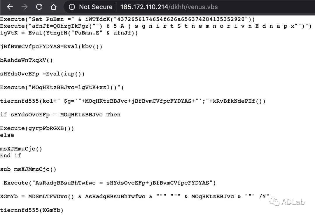 最后执行的恶意代码是图21所示的一个Powershell脚本,不过该脚本执行的命令做了字符混淆处理。脚本在执行时先是将混淆过的字符串转换成字符数组,然后调用Reverse函数逆序排列该字符数组,再将逆序后的字符数组拼接成字符串,后面的操作是将字符串中的填充字符‘&’去掉再转化成16进制编码。经过这样的几步处理,执行命令就被还原出来了(见图22),从图22中我们可以看到该Powershell脚本实际上是一个下载器,它会从远程服务器http://185.172.110.214/dkhh/venus.vbs上下载一个VBS文件来执行。