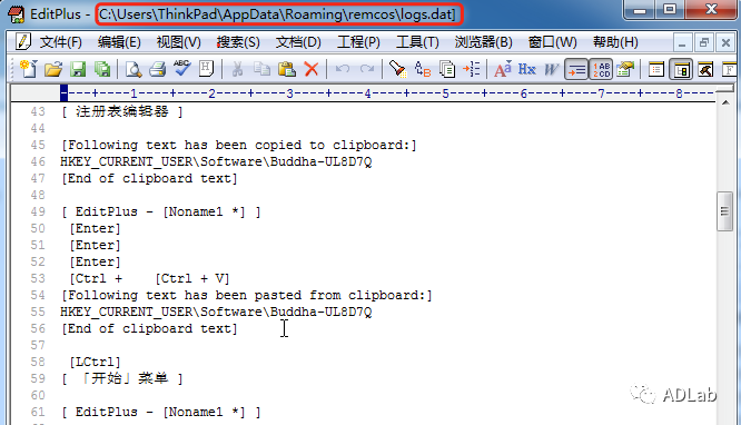Remcos RAT木马会启动键盘记录线程来窃取受感染主机的键盘输入信息和剪切板数据。木马将窃取的这些信息保存在本地文件“%Appdata%\remcos\logs.dat”中。在以前的有些版本中logs.dat文件是加密的,不过在此次我们分析的这个版本中log.dat文件没有加密,数据的记录格式和之前的版本基本类似(如图34),木马后续会将收集到的这些记录日志发送到C&C服务器。
