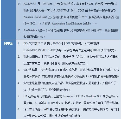 现在我们仍以公有云为例,下面通过AI技术热点方向及安全产品能力两个维度看一下当前国内外的云服务提供商自身在新技术能力支撑、安全产品方案方面布局与积累。以下两个表格分别对比列举了国外的亚马逊AWS云及国内的阿里云的相关情况。