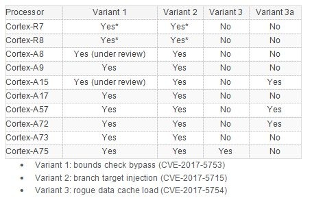 ARM确认大部分处理器不受漏洞影响,但给出了一个受影响的处理器列表。