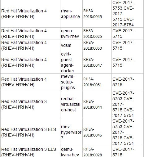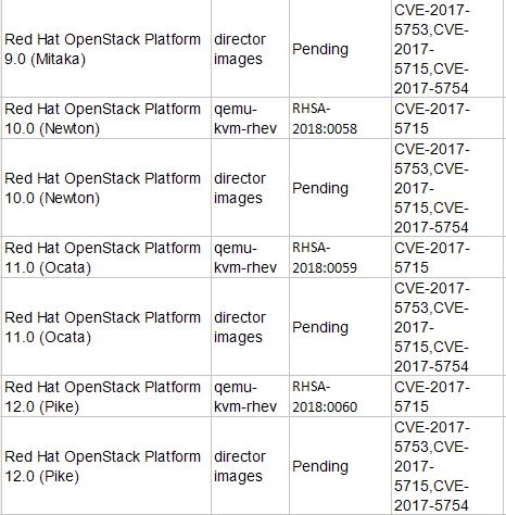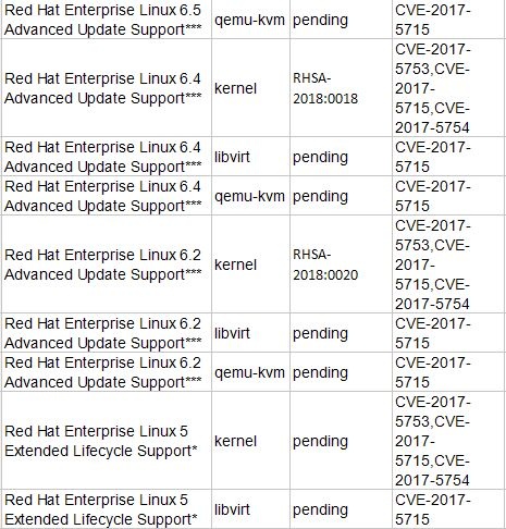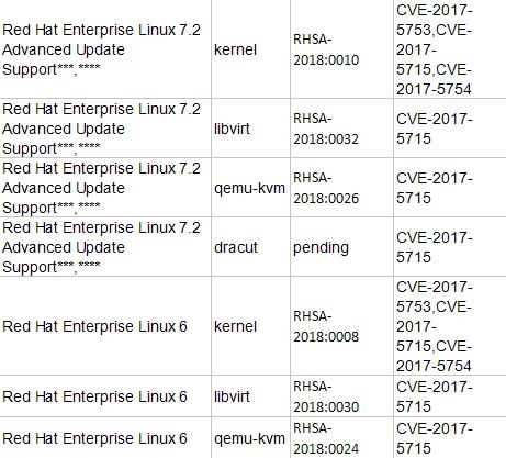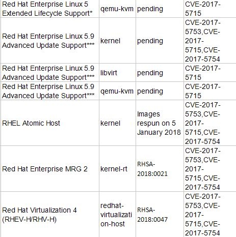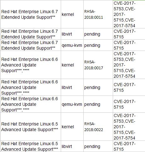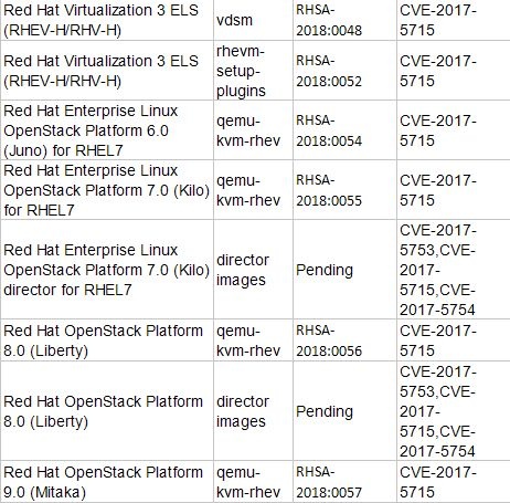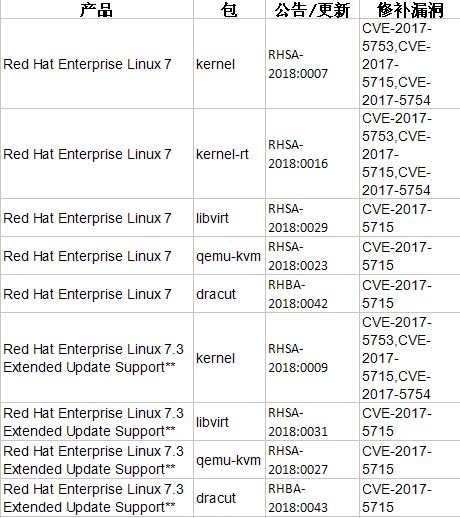 红帽公司已经发布一项建议,其中列出受到影响的产品及其当前状态。建议内容表明:对于正在运行受影响版本产品的红帽客户,强烈建议用户尽快根据指导清单进行更新。所有受影响产品都应安装修复补丁,借以缓解CVE-2017-5753 (变种1)与 CVE-2017-5754 (变种3)漏洞。CVE-2017-5715 (变种2)可通过本地以及虚拟访客边界两种方式被加以利用。具体如下: