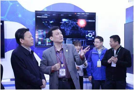 启明星辰集团总裁严立(右一)为河南省副省长刘伟(左一)等省市领导介绍智慧城市安全运营平台