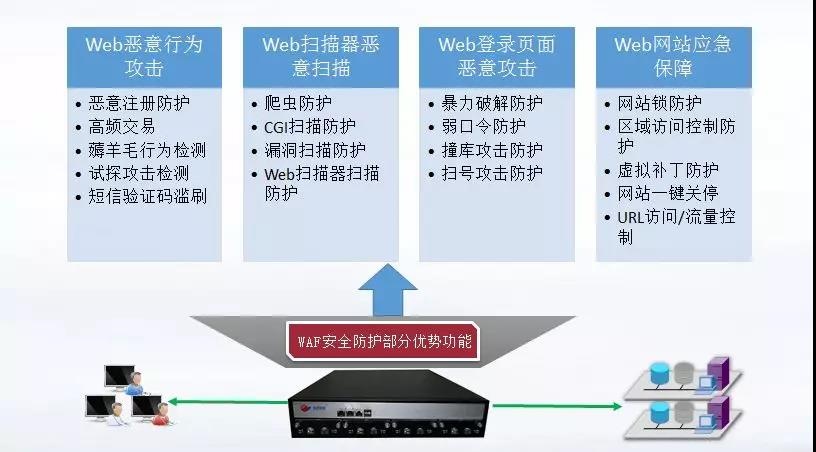 启明星辰WAF产品团队秉承公司诚信和创新精神,研发的基于客户场景的安全防护产品优势功能如下: