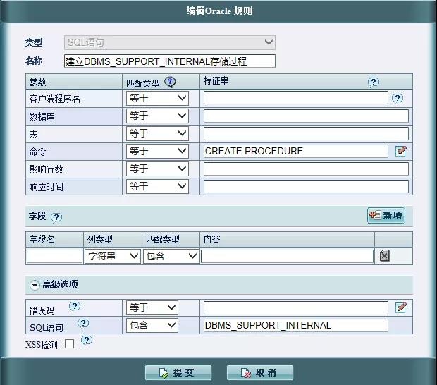 依次创建四个存储过程DBMS_SUPPORT_INTERNAL、DBMS_SYSTEM_INTERNAL、DBMS_CORE_INTERNAL、DBMS_STANDARD_FUN9和三个触发器DBMS_SUPPORT_INTERNAL、DBMS_SYSTEM_INTERNAL、DBMS_CORE_INTERNAL的检测规则,针对这些操作规则建立审计和阻断策略。