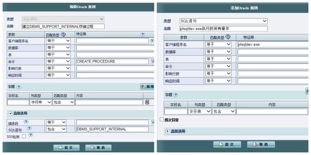 定义规则,对客户端工具为PL/SQL的所有操作进行记录,对其存储过程和触发器操作进行告警。如图建立规则并依次选择对应的响应方式,建立审计策略: