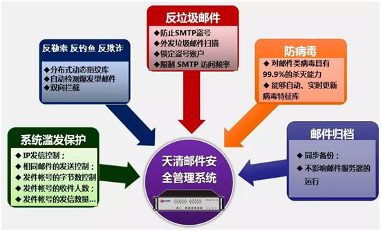 天清邮件安全管理系统对所有进出系统的邮件进行双向病毒扫描,对于内部账号因中毒被作为木马,发送垃圾邮件,将第一时间限制并阻止其对外散播此类邮件,有效地保护系统内部安全,避免由此可能被列入黑名单。