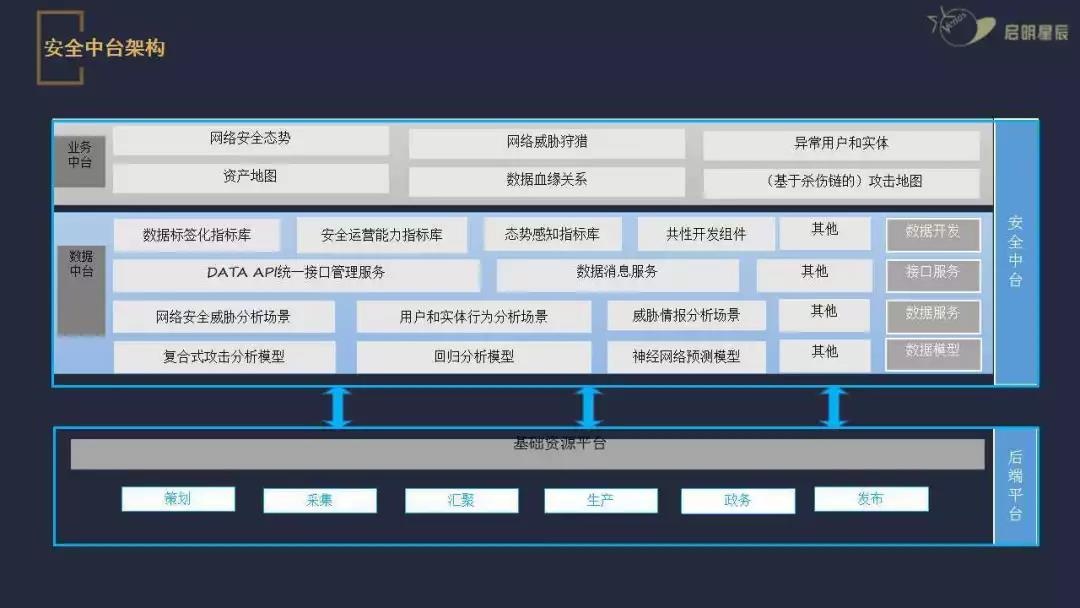 首先,安全中台一般由安全业务中台和安全数据中台组成,二者相辅相成业务沉淀数据,数据反哺业务。业务中台的基础是构建安全业务的共享服务,抽取出安全业务的共性服务,摆脱烟囱式业务条线,打通数据孤岛;数据中台是一种系统架构,依托数据沉淀核心业务服务,持续不断地衍生出数据服务来支撑业务创新需求。