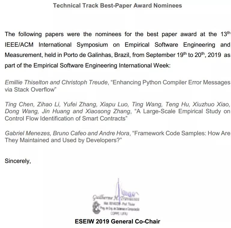 启明星辰ADLab联合电子科技大学计算机学院(网络空间安全学院)陈厅副教授首次对以太坊区块链智能合约控制流的识别进行了大规模研究。该成果《A Large-Scale Empirical Study on Control FlowIdentification of Smart Contracts》于2019年发表在中国计算机学会(CCF)推荐的B类学术会议International Symposium on Empirical SoftwareEngineering and Measurement。
