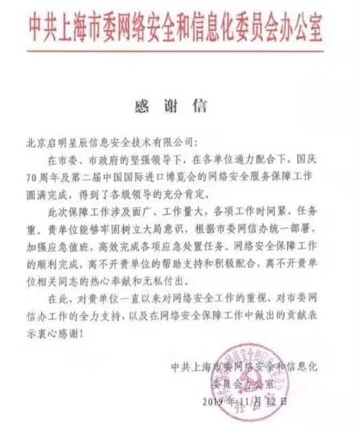 近年来,启明星辰通过不断的技术积累与自主创新,先后全面出色完成北京2008年奥运会、2010年上海世博会、2010年广州亚运会、2012年亚欧博览会、2014年APEC大会、2016年G20杭州峰会、2017年一带一路峰会、2018年青岛上合峰会、博鳌亚洲论坛、上海世博会、首届进博会以及嫦娥号、天宫号、玉兔号、2019年两会、一带一路高峰论坛、国庆70周年、世界园艺博览会、亚洲文明对话等众多国家级重大安保项目,已成为国家网络安全发展中不可或缺的主力军。