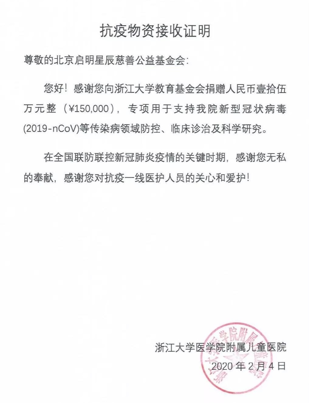 启明星辰捐助浙江大学附属儿童医院抗击新型冠状病毒(2019-nCoV) 的捐款已经汇出,捐款专项用于该医院救助和相关科研工作。