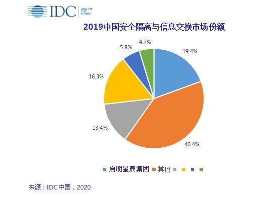 发布时间 2020-06-22近日,国际权威调研分析机构IDC首次针对安全隔离与信息交换市场发布《2019年中国安全隔离与信息交换市场跟踪报告》,报告显示:启明星辰集团的安全隔离与信息交换类产品以19.4%的市场份额位居榜首。