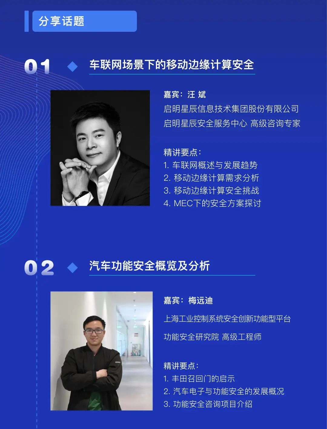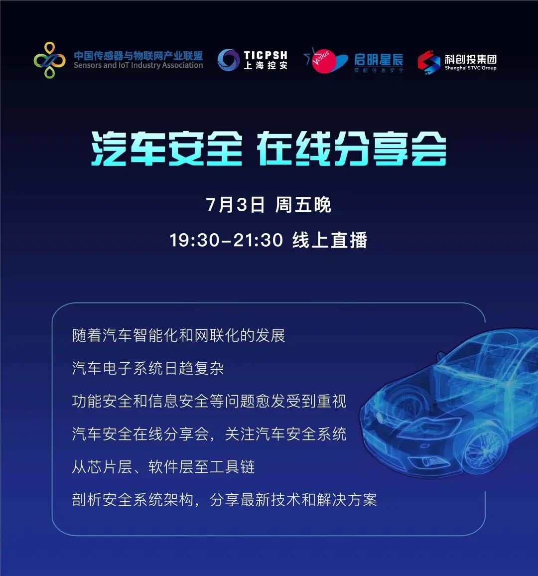 本次分享会由启明星辰集团、中国传感器与物联网产业联盟、上海控安、科创投集团联合主办,邀请了科研机构、零部件厂商、车厂等行业的各位专家在线分享汽车安全,从芯片层、软件层到工具链,剖析整个汽车安全系统架构,并围绕汽车全产业链的安全保障、信息安全防护、大交通及新基建发展趋势及场景展开讨论。