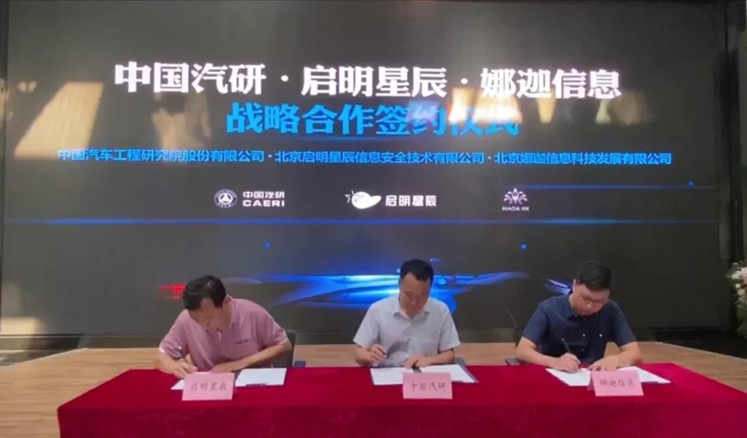 同时,启明星辰还与中国汽研、娜迦信息基于“优势互补、共同发展、实现共赢”的目标,正式签署战略合作协议,建立长期战略合作伙伴关系,就推进智能网联汽车、智能机器人、汽车网络安全等相关方面的产品发展规划、新产品开发、试验检测、科研课题等方面展开深入的合作,全面提升三方在智能网联汽车信息安全领域的专业技术能力,加强市场影响力。