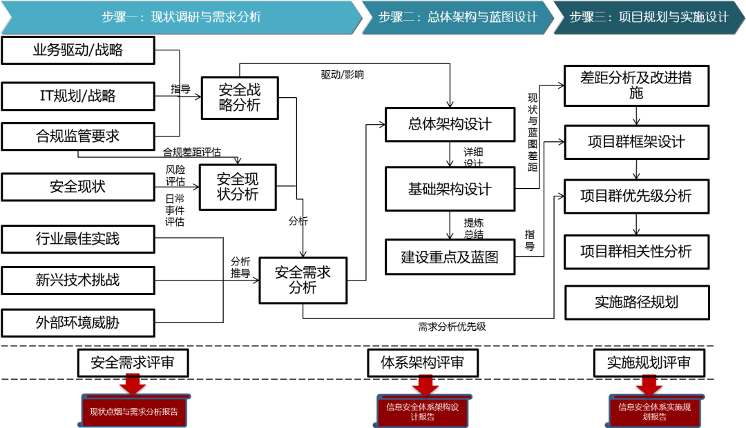 启明星辰为某汽车集团提供的网络安全规划服务主要内容包括:现状调研与需求分析、总体架构与蓝图设计、项目计划与实施设计,如下图所示: