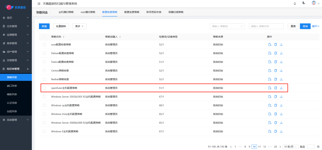 启明星辰通过天镜脆弱性扫描与管理系统为 openEuler 操作系统建立专门的安全配置基线策略。该策略提供了账号管理、口令策略、系统服务、日志审计、网络通信等配置内容的安全基线评估,并与 openEuler 社区同步更新,确保 openEuler 开源操作系统安全基线的精准检测。另外,启明星辰还提供系统安全配置基线的配置规范和技术指导,确保系统配置符合安全配置基线标准和最佳实践,简化安全管理和维护工作,提升系统整体安全防护能力。