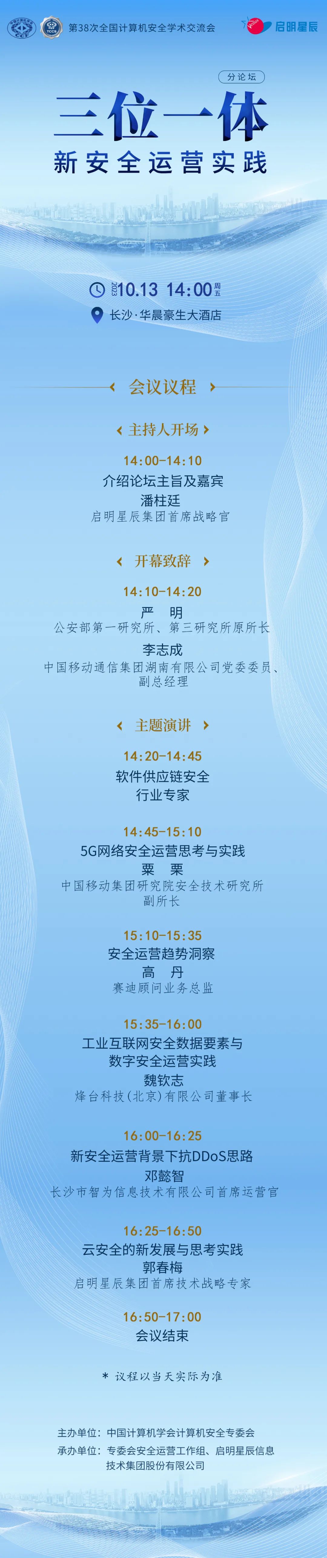 在第38次全国计算机安全学术交流会期间,启明星辰集团将联合安全运营工作组于10月13日共同承办“三位一体”新安全运营实践分论坛,从政策文件解读、产业趋势洞察、实践应用分享等多个角度展开探讨,共话“三位一体”新安全运营发展的未来之路。