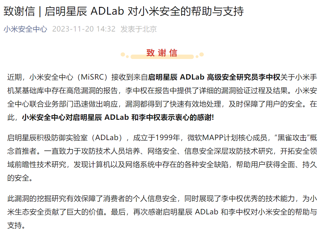 启明星辰发现手机基础库高危漏洞,小米公开致谢