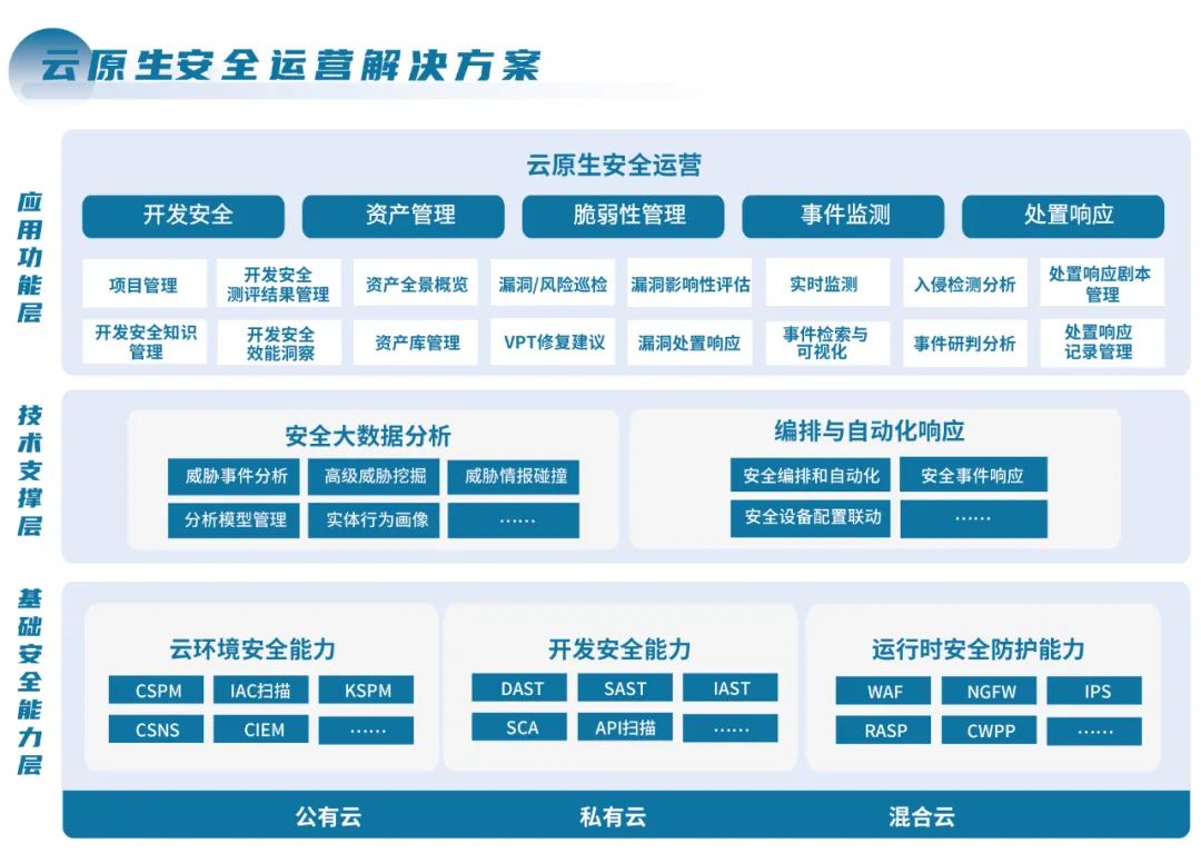 启明星辰集团云原生安全运营解决方案结合云原生以及云的特性,利用大数据技术,将各类云原生安全及云安全的能力进行数据及能力的整合。通过融合分析技术的运用,及时发现异常与违规以及潜在威胁事件;通过与开发安全等类能力的对接,及时掌握开发安全项目情况,并进行效能洞察。方案整合了运营资产管理、脆弱性监测、事件监测、处置响应、考核评价等能力,可连通云原生运营过程中的安全要素信息,实现体系化、流程化、指标化的安全运营。