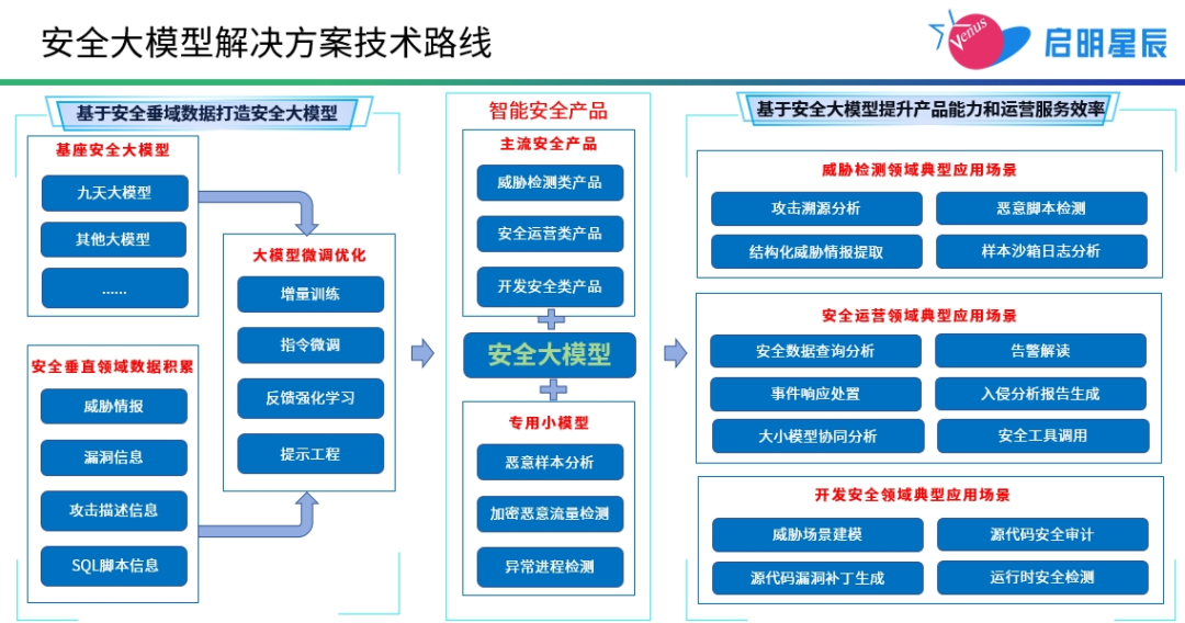 李陟分享了启明星辰安全大模型解决方案技术路线图。以中国移动九天大模型为基座,结合启明星辰丰富的安全数据集,进行全量预训练和微调,打造安全大模型。同时,通过安全大模型、专用小模型、安全产品的智能组合,提升产品能力和运营服务效率并应用到威胁检测、安全运营、开发安全等安全场景中。