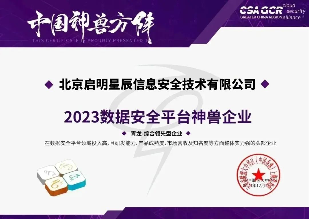 启明星辰凭借在数据安全领域长期积累的技术实力和品牌影响力,入选“2023数据安全平台·青龙神兽企业”。青龙作为四灵之首,在神兽方阵模型中是综合领先型企业的象征,这也代表着启明星辰被认证为数据安全平台领域投入高,且研发能力、产品成熟度、市场营收及知名度等方面整体实力强的头部企业。