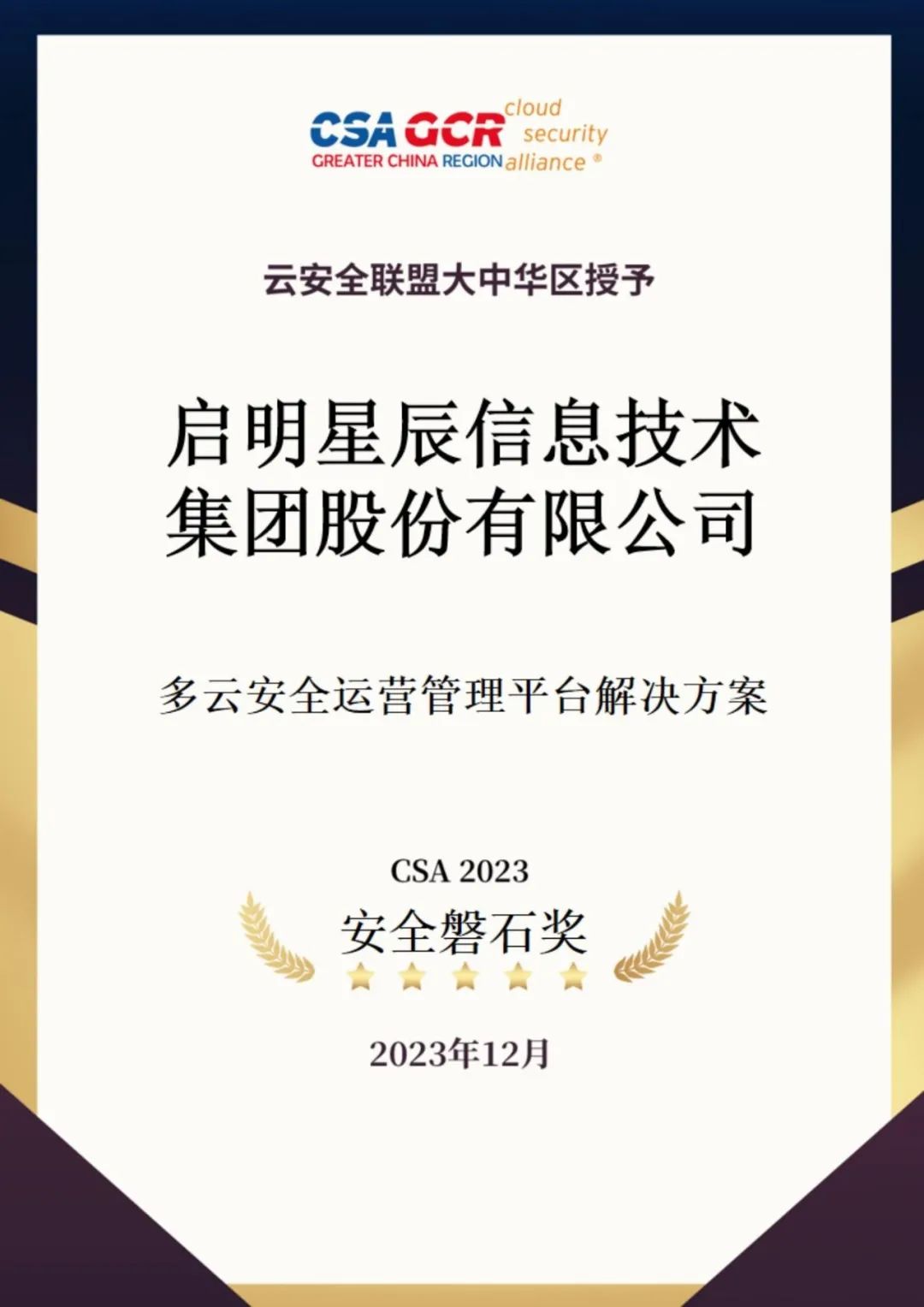 “CSA2023 安全磐石奖”是CSA最具含金量的奖项之一,代表获奖企业在安全能力建设方面取得突出成就,且具备较强的组织安全能力和防护体系,能够有效解决用户在新型网络环境中安全问题,为行业发展提供良好的参考价值及引领作用。启明星辰凭借在数字安全领域体系化、前瞻性的综合解决方案,获得该项荣誉。