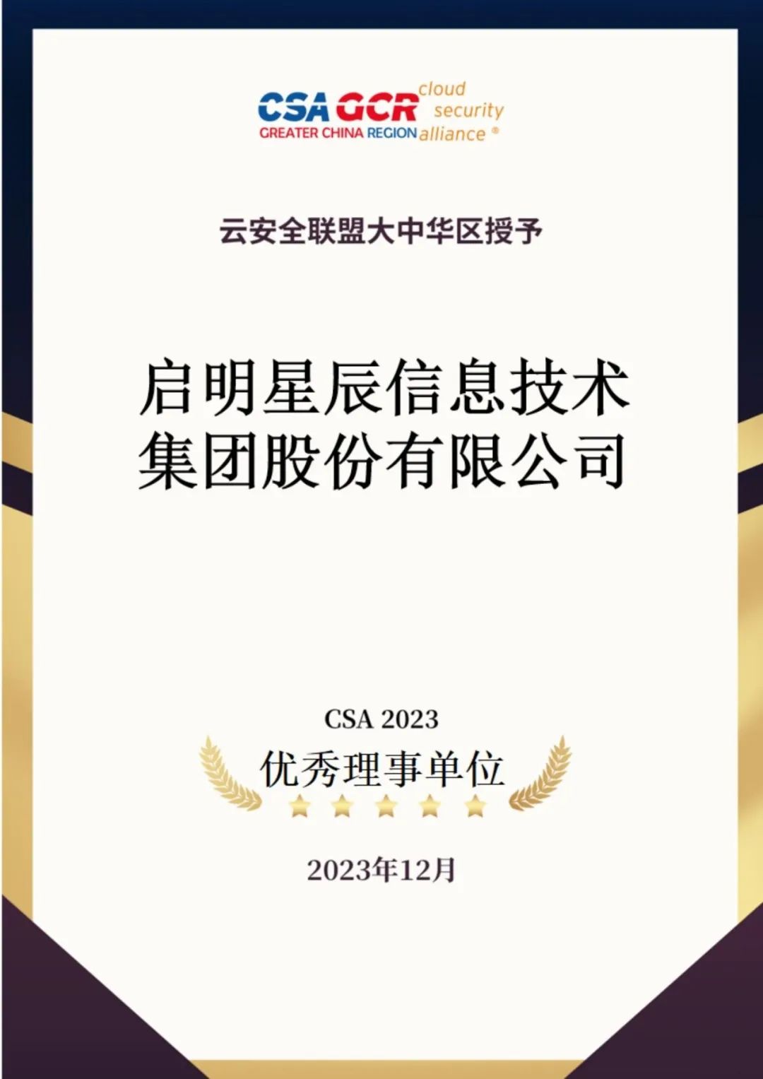作为CSA大中华区优秀理事单位,启明星辰一直以来积极参与联盟2023年度相关工作,凭借在安全研究、人才培养等方面的突出贡献获得CSA大中华区的认可。