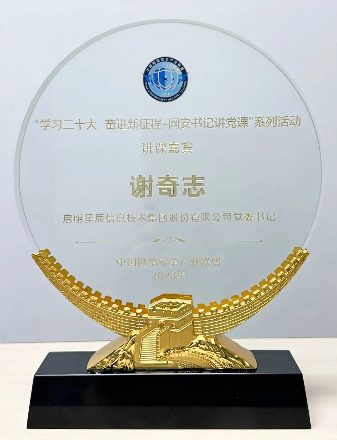 此外,启明星辰集团深入贯彻党的二十大精神,积极参与CCIA组织开展的“学习二十大 奋进新征程——网安书记讲党课”系列活动,围绕新时代网络安全面临的风险和挑战,结合我国网安事业发展实际,分享学习贯彻二十大精神的心得体会和实践经验,着力推动网信安全事业迈上新台阶、开创新格局。会上,启明星辰集团党委书记谢奇志被授予讲课嘉宾称号。