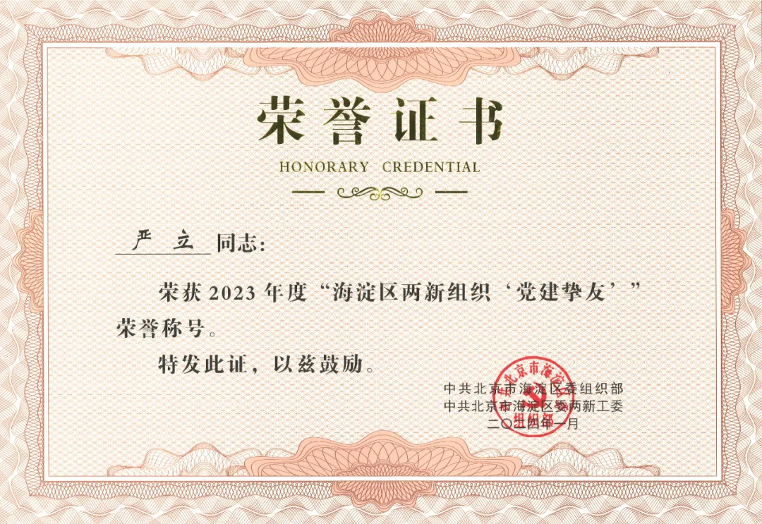 启明星辰总裁严立获海淀区两新组织“党建挚友”荣誉称号