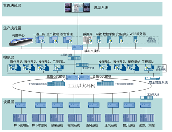 矿井综合自动化系统是整个矿井安全生产监控系统信息的集成,包括矿井提升、皮带输送、通风系统、电力监控系统、安全监测系统等业务系统,一般采用AB、西门子或ABB控制系统进行控制,同时依靠一个快速、安全、可靠的网络平台为大量的信息流动提供支撑,拥有一个功能全面的安全生产信息应用系统为矿井安全生产提供科学调度、决策的依据。今后相当长的时间内,煤炭仍然是中国的主要能源,目前煤炭企业正逐渐由粗放开采向安全高效开采转变。加强信息化建设,重视信息安全是煤炭实现安全生产的基本保障。