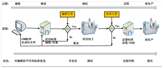 为提升机床效率和利用率,逐步建立DNC网络,可实现统一的机床管理和实时监测,同时使设计和生产直接连接,DNC通常国外使用的品牌有Cimco和Predator。国内提供DNC网络的主要是数码大方和蓝光,DNC传输主要是基于TCP/IP协议,DNC的采集是通过OPC、MODBUS及厂家自身协议等。数控系统的管理流程如下图所示: