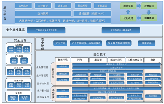 通过建立符合某公司工控系统的信息安全管理体系、信息安全技术防护体系、信息安全运行体系,并将三个体系与IT安全现有体系融合,形成“三个体系,一个中心”的信息安全保障体系框架,实现办公网和生产网信息安全一体化管理和监控,支撑XX公司智能制造生产和应用。