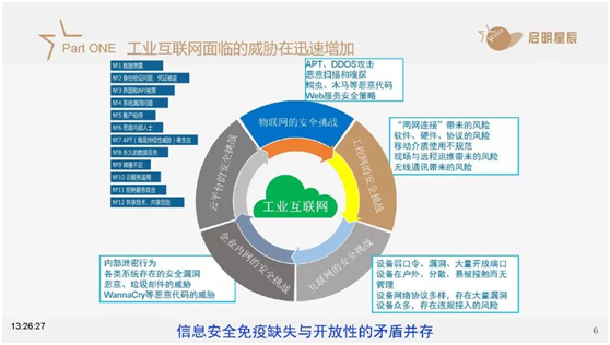 启明星辰信息技术集团股份有限公司工业互联网安全事业部副总经理原真做题为《工业互联网背景下的网络安全实践》的报告,他认为随着两化融合、数字化中国的推进,自动化、智能化、网络化在提升工业企业产品质量、效率方面提供了巨大的推动力,在推进信息化的同时,当前复杂环境下需要企业直面来自网络空间的威胁和挑战。他在报告中介绍了工业互联网发展面临的威胁与挑战,分析了工业互联网的脆弱性形势,最后提出了应对工业互联网发展需要聚焦的安全点和网络安全建设的思路。
