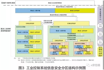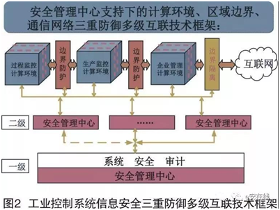 工业控制系统的等级保护防护方案设计参照以往构建在安全管理中心支持下的计算环境、区域边界、通信网络三重防御体系,采用分区的架构,结合工业控制系统总线协议复杂多样、实时性强、节点计算资源有限、设备可靠性要求高、故障恢复时间短、安全机制不能影响实时性等特点进行设计,以实现可信、可控、可管的系统安全互联、区域边界安全防护和计算环境安全,如图2所示。