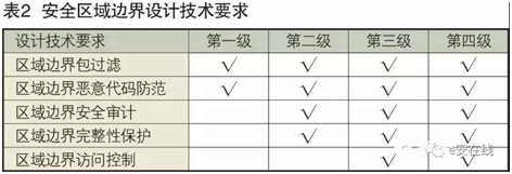安全区域边界是指对定级系统的安全计算环境边界,以及安全计算环境与安全通信网络之间实现连接并实施安全策略的相关部件。安全区域边界按照保护能力划分为第一级安全区域边界、第二级安全区域边界、第三级安全区域边界和第四级安全区域边界,安全区域边界设计技术要求逐级增强,各等级要求如表2。