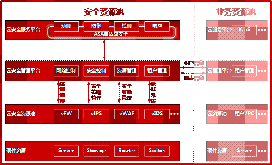 自适应安全可以通过安全能力间融合联动,实现针对虚拟化资源池云环境下的常规威胁及高级定向威胁的防护和保障,融合联动安全的具体实现是通过集中化的云安全管理与服务平台加上虚拟化安全资源池内的产品和服务,进行松耦合的模块化对接,形成预测、防护、检测、响应的闭环体系。