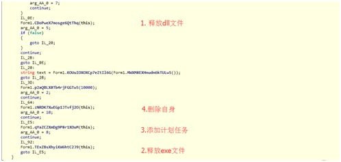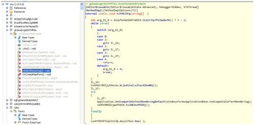 2.QuasarRAT木马采用C#编写,但最新发现的木马外层添加了一段Loader代码。Loader代码的主要功能是反检测反沙箱功能,并在最后加载原始QuasarRAT木马。QuasarRAT木马采用高强度混淆处理。
